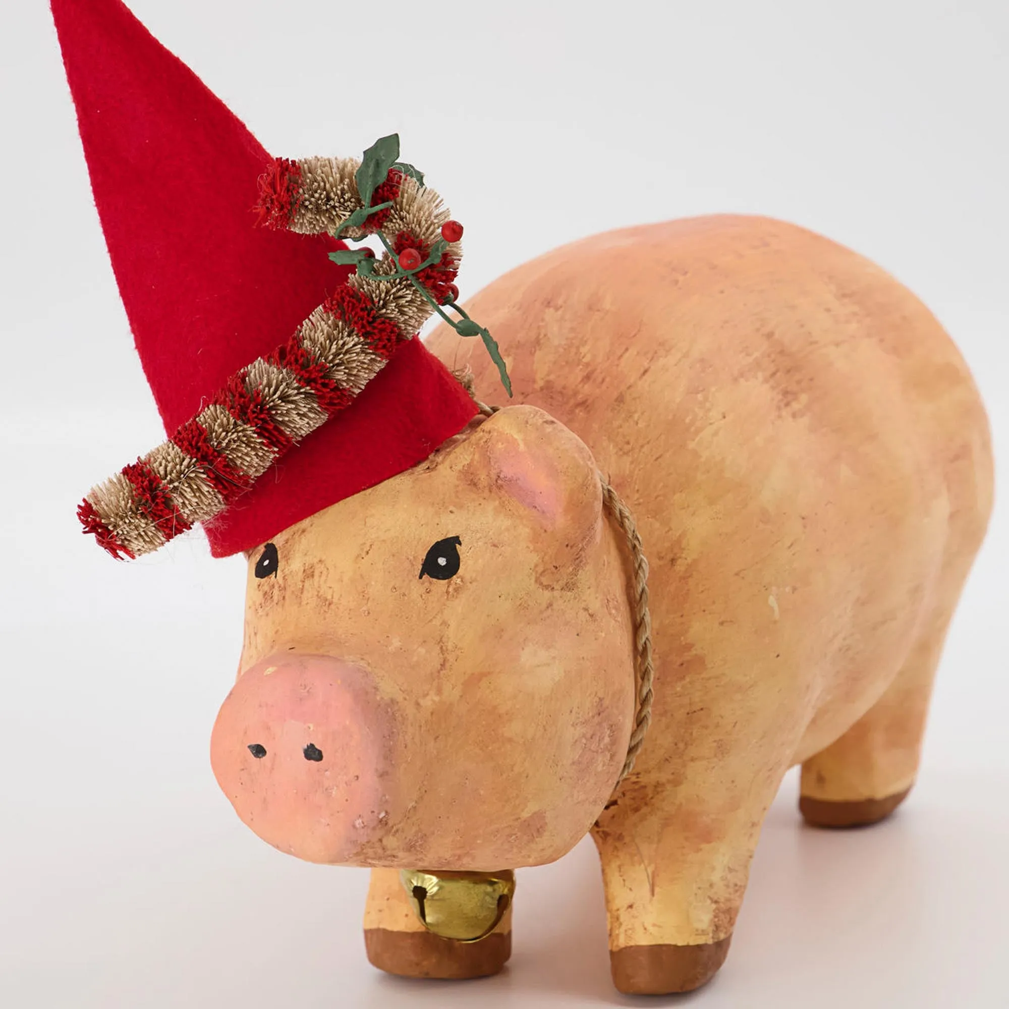 Das Schweinchen trägt eine niedliche Weihnachtsmannmütze, hält ein Zuckerrohr in der Hand und läutet mit einem kleinen Glöckchen, was es zu einem perfekten Begleiter für die festliche Jahreszeit macht.