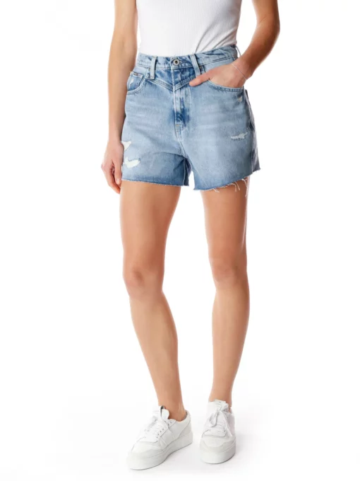 Denim-Shorts mit hoher Leibhöhe*Mittelblauer Grundton relativ stark ausgewaschen*Schmaler Bund mit Gürtelschlaufen*Button-Zip-Verschluss*Five-Pocket-Style*Gesäßtaschen mit dezenter Stickerei*Offene ausgefranste Beinabschlusskante*Destroyed-Effekte*Label-Patch auf der Rückseite*Regular-Fit*Länge: Mitte des Oberschenkels*Unser Model trägt bei einer Größe von 1.73m die Gr. 26