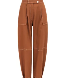 Diese sehr detaillierte Ballonhose besteht aus Baumwolle und hat kontrastierende braune Nähte. Sie haben außerdem Klappen an der Taille, die je nach Wunsch nach oben oder unten getragen werden können. An den Seiten befinden sich aufgesetzte Taschen, ebenfalls mit Kontrastnähten. Vervollständigen Sie Ihren von Arbeitskleidung inspirierten Look mit der Jacke oder einem T-Shirt des Sets und flachen Schuhen.