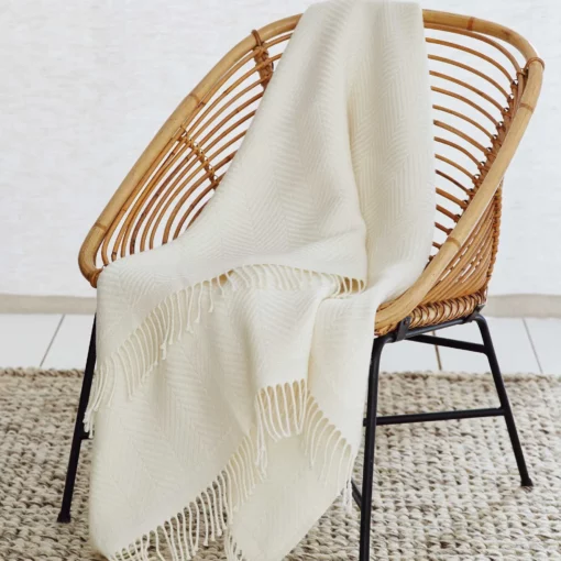 Mit viel Liebe zum Detail wird 100% natürliche und gekämmte Schurwolle aus Neuseeland von unseren dänischen Partnern in Twill zu dem filigranen Fischgratmuster verwoben, das unsere wunderschöne und wärmende Wolldecke Salla so einzigartig macht. Mit verdrehten Fransen versehen ist die stilvolle Decke ein modernes Accessoire für Ihr Zuhause.
